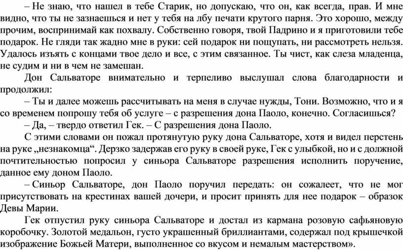 С этими словами он пожал протянутую руку дона Сальваторе, хотя и видел перстень на руке „незнакомца“. Дерзко задержав его руку в своей руке, Гек с улыбкой, но и с должной почтительностью попросил у синьора Сальваторе разрешения исполнить поручение, данное ему доном Паоло.