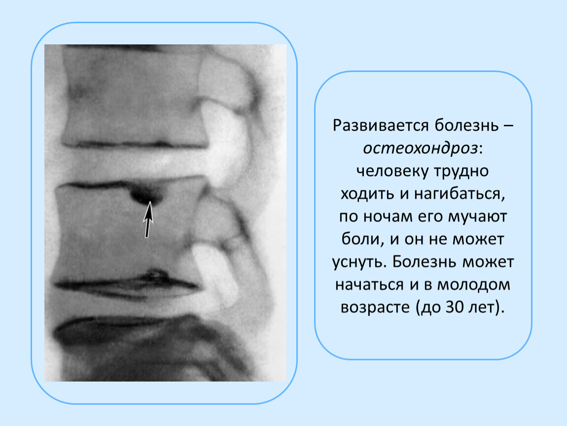 Развивается болезнь – остеохондроз: человеку трудно ходить и нагибаться, по ночам его мучают боли, и он не может уснуть. Болезнь может начаться и в молодом возрасте (до 30 лет).