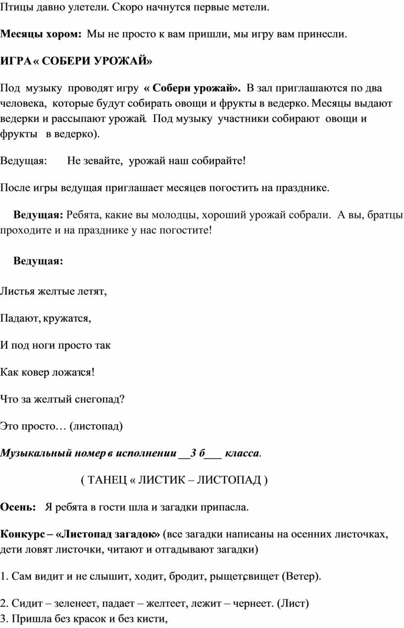 ( Под музыку проводят игру « Собери урожай». В зал приглашаются по два человека, которые будут собирать овощи и фрукты в ведерко. Месяцы выдают ведерки и рассыпают урожай. Под музыку участники собирают овощи и фрукты в ведерко).