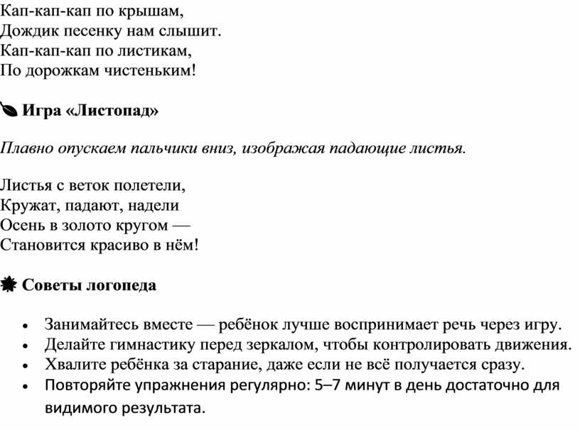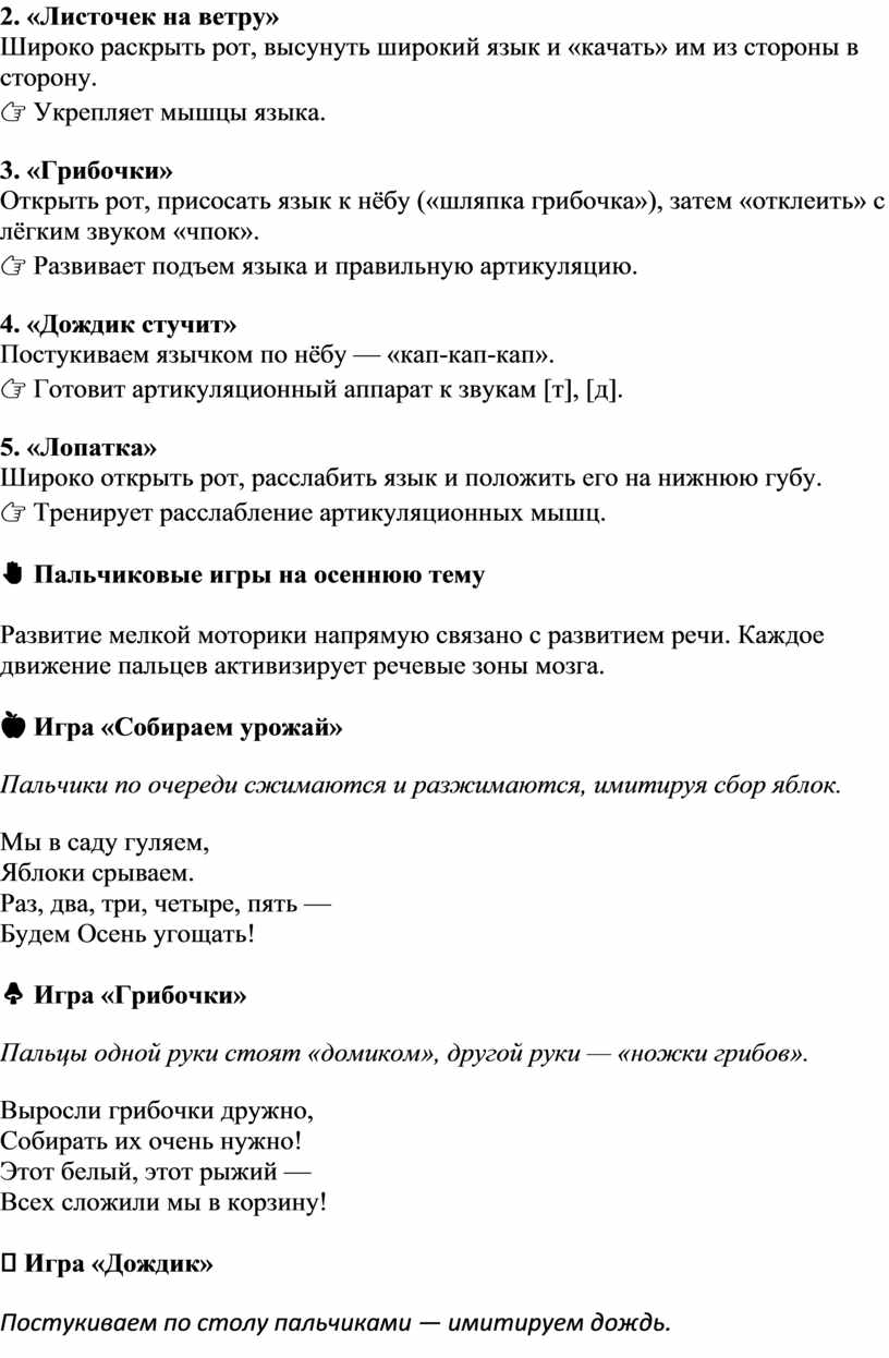 Осень — отличное время для развития речи, внимания и моторики у детей. Предлагаем упражнения и игры, которые помогут укрепить артикуляционный аппарат, улучшить дикцию и развить мозговую активность через движение и игру.