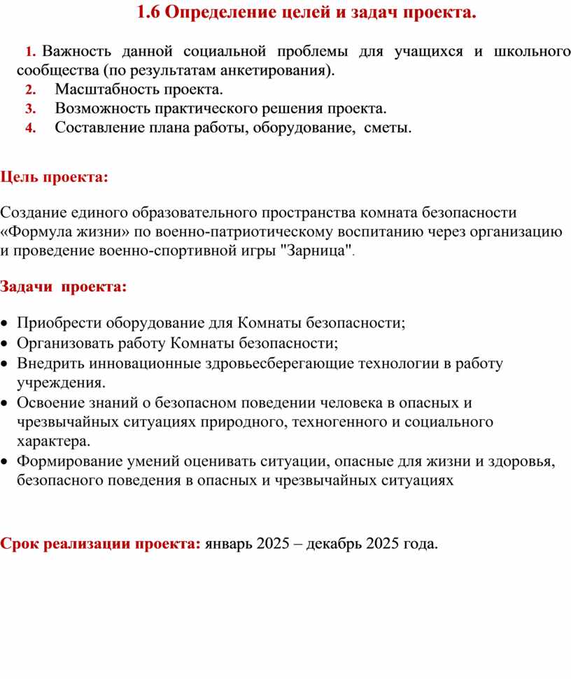 Формулировка социальной проблемы: Отсутствие современно оборудованного помещения не позволяет в полном объеме использовать здоровьесберегающие инновацонные технологии для укрепления здоровья воспитанников, родителей, педагогов и вовлечения их в физкультурно-оздоровительную деятельность. Реализация данного проекта позволит повысить уровень знаний и умений, приобщить к здоровому образу жизни участников учебно-воспитательного процесса. • Повышение социальной активности детей, их гражданской позиции, пропаганда добровольческой деятельности; • Проведение массово – разъяснительной работы • Создание условий для приобретения обучающихся позитивного, социального опыта · через участие в проекте Создания комнаты безопасности «Формула жизни» · приобретение и закрепление участниками навыков начальной подготовки, формирование личностных качеств участников, способствующих успешной самореализации молодежи в трудовой, семейной и творческой сферах, формирование прочных основ патриотического сознания, чувства верности долгу по защите своего Отечества, активной гражданской позиции, а также развитие патриотического движения и системы исторически сложившихся военно-патриотических игр в Российской Федерации. · развитие практических умений и навыков поведения в экстремальных ситуациях.