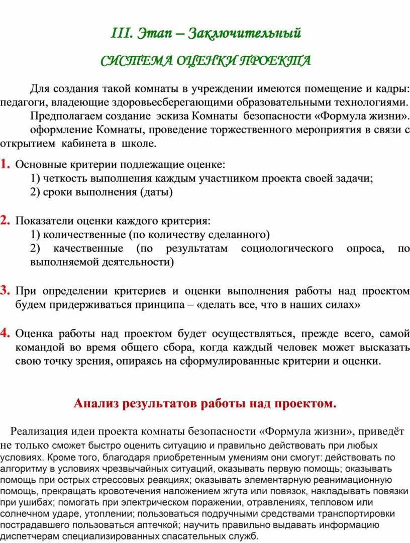 Предполагает: сбор информации по проблеме, совместно с представителями администрации школы, родительского комитета, совета старшеклассников; чтение предложенной литературы по созданию комнаты безопасности «Формула здоровья», проведение социологического опроса, создание инициативной группы, координирующей проект, старт проекта.