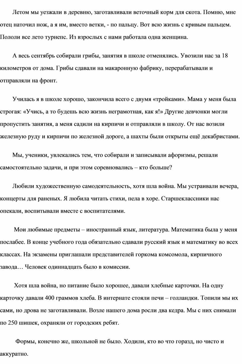 Летом мы уезжали в деревню, заготавливали веточный корм для скота. Помню, мне отец наточил нож, а я им, вместо ветки, - по пальцу. Вот всю жизнь с кривым пальцем. Пололи все лето турнепс. Из взрослых с нами работала одна женщина.