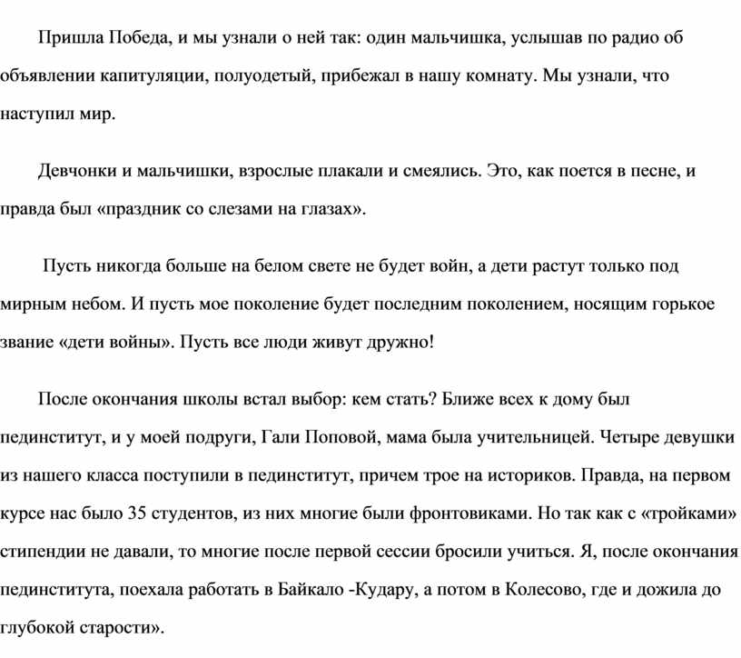 Пусть никогда больше на белом свете не будет войн, а дети растут только под мирным небом. И пусть мое поколение будет последним поколением, носящим горькое звание «дети войны». Пусть все люди живут дружно!