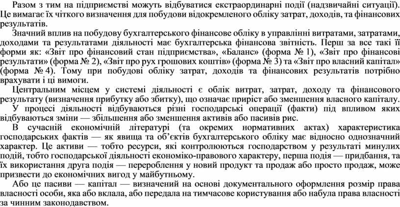 Разом з тим на підприємстві можуть відбуватися екстраординарні події (надзвичайні ситуації). Це вимагає їх чіткого визначення для побудови відокремленого обліку затрат, доходів, та фінансових результатів.