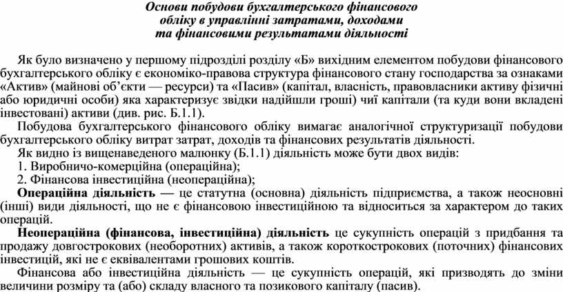 Як було визначено у першому підрозділі розділу «Б» вихідним елементом побудови фінансового бухгалтерського обліку є економіко-правова структура фінансового стану господарства за ознаками «Актив» (майнові об’єкти — ресурси) та «Пасив» (капітал, власність, правовласники активу фізичні або юридичні особи) яка характеризує звідки надійшли гроші) чиї капітали (та куди вони вкладені інвестовані) активи (див. рис. Б.1.1).