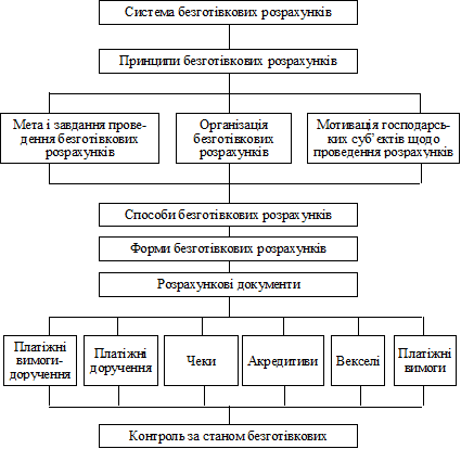 Безготівкові розрахунки між підприємствами виконуються платіжними вимогами, акредитивами, особистими рахунками, платіжними дорученнями, чеками, зведеними вимогами, інкасовими дорученнями та іншими, дозволеними законами.