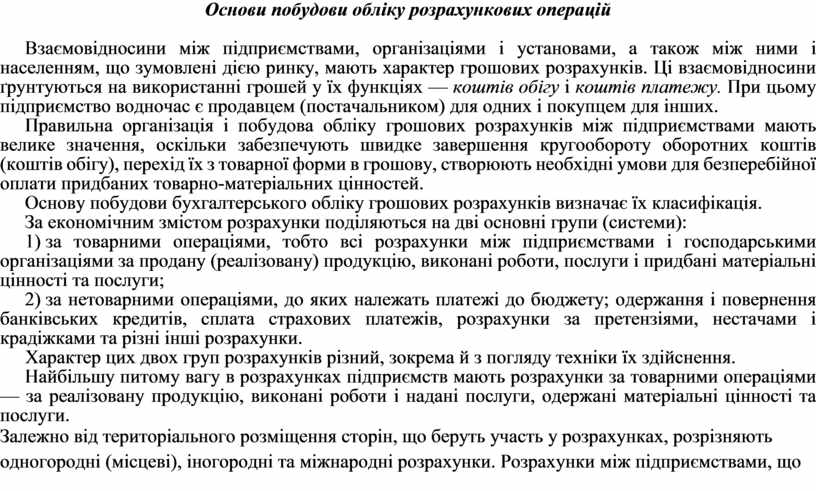 Технічні форми розрахунків. Під формою розрахунків розуміють зумовлені характером економічних зв’язків способи здійснення платежів, порядок документообороту і обігу коштів як між учасниками розрахунків, так і між ними і банком. При цьому підприємства можуть застосовувати лише ті форми розрахунків, які встановлені законами і постановами уряду та є обов’язковими для всіх учасників платіжного обігу. Залежно від умов господарської діяльності підприємств, характеру продукції, що реалізується, і умов її відпуску покупцям, місцезнаходження платників, джерел коштів, за рахунок яких виконуються платежі, і місця їх проведення, застосовуються ті чи інші форми розрахунків.