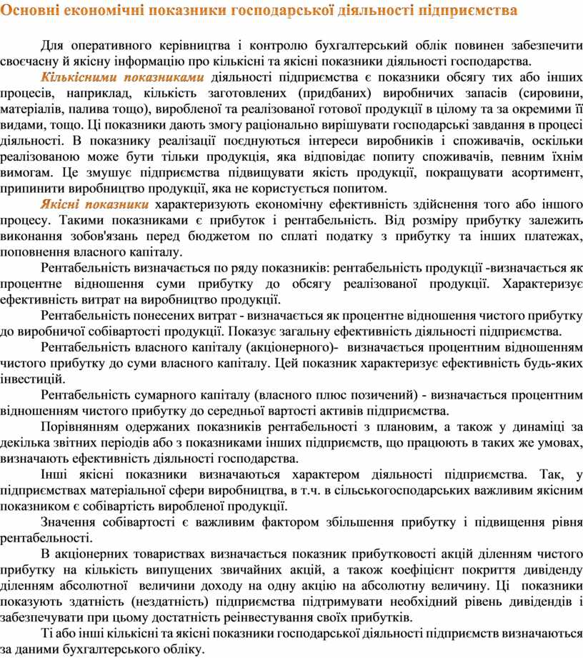 Якісні показники характеризують економічну ефективність здійснення того або іншого процесу. Такими показниками є прибуток і рентабельність. Від розміру прибутку залежить виконання зобов'язань перед бюджетом по сплаті податку з прибутку та інших платежах, поповнення власного капіталу.