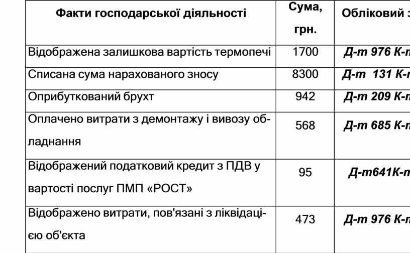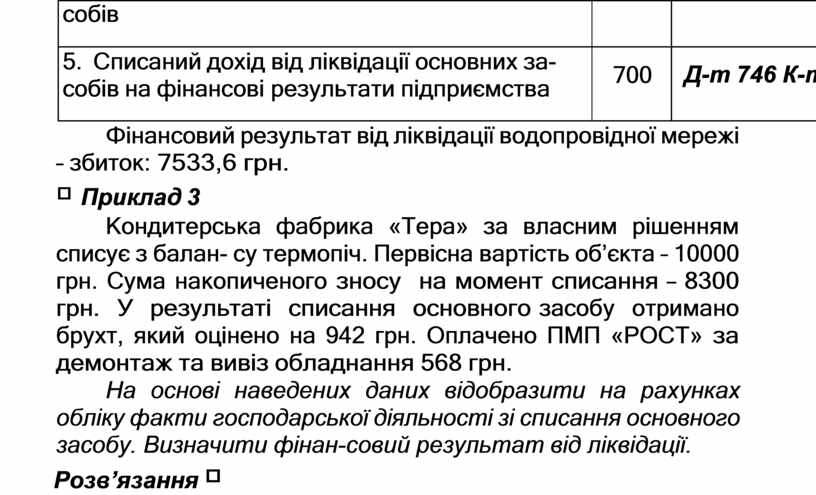 Кондитерська фабрика «Тера» за власним рішенням списує з балан- су термопіч. Первісна вартість об’єкта – 10000 грн. Сума накопиченого зносу на момент списання – 8300 грн. У результаті списання основного засобу отримано брухт, який оцінено на 942 грн. Оплачено ПМП «РОСТ» за демонтаж та вивіз обладнання 568 грн.