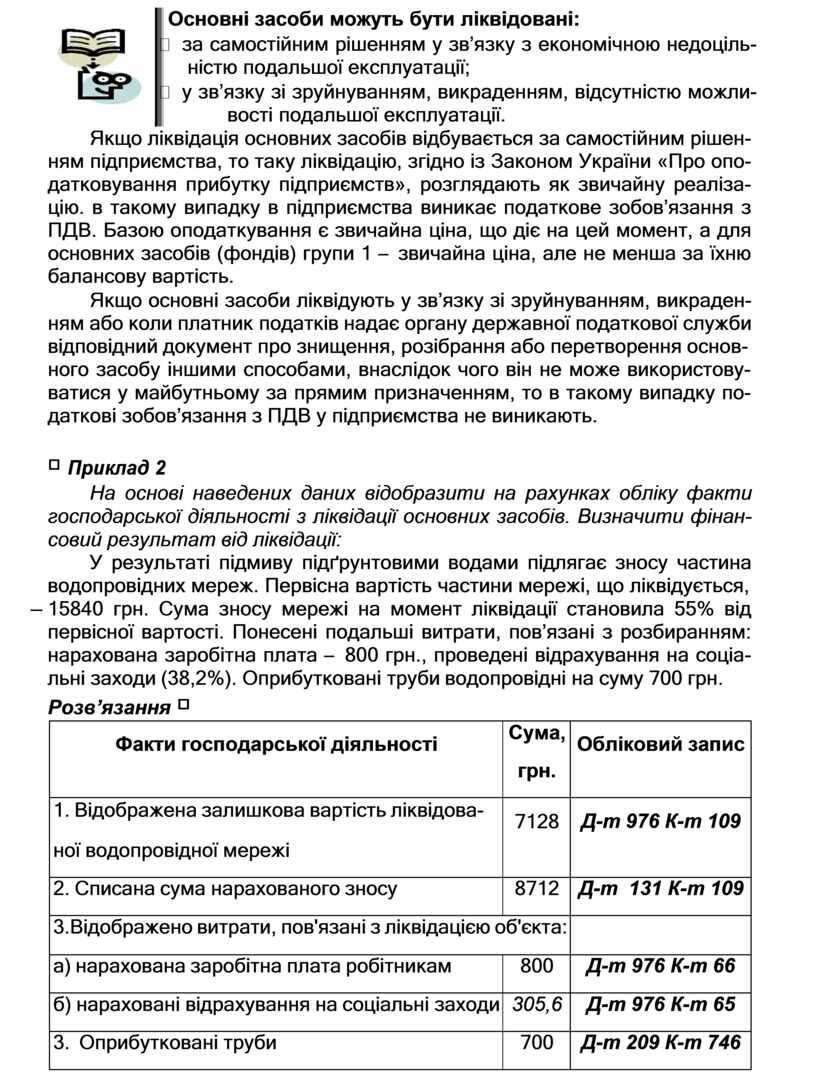 – 15840 грн. Сума зносу мережі на момент ліквідації становила 55% від первісної вартості. Понесені подальші витрати, пов’язані з розбиранням: нарахована заробітна плата – 800 грн., проведені відрахування на соціа- льні заходи (38,2%). Оприбутковані труби водопровідні на суму 700 грн.