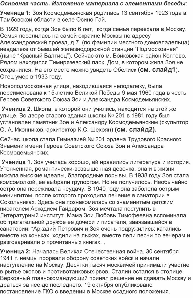 Ученица 2. Специально созданная комиссия установила подлинное имя партизанки. Ею оказалась 18-летняя комсомолка Зоя Космодемьянская. 16 февраля 1942 г. Зое Анатольевне Космодемьянской было присвоено звание Героя Советского Союза посмертно.