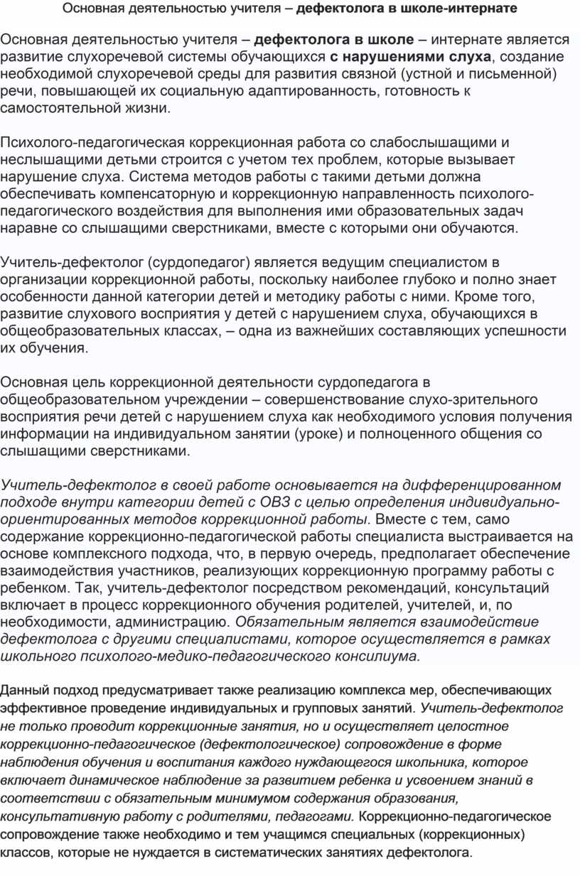 Основная деятельностью учителя – дефектолога в школе – интернате является развитие слухоречевой системы обучающихся с нарушениями слуха, создание необходимой слухоречевой среды для развития связной (устной и письменной) речи, повышающей их социальную адаптированность, готовность к самостоятельной жизни.