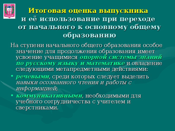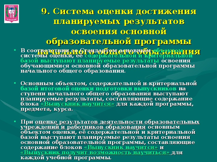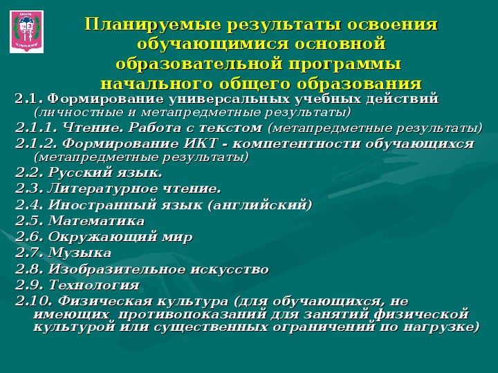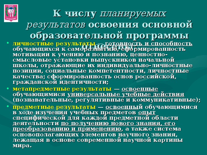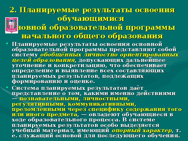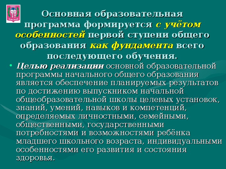 Целью реализации основной образовательной программы начального общего образования является обеспечение планируемых результатов по достижению выпускником начальной общеобразовательной школы целевых установок, знаний, умений, навыков и компетенций, определяемых личностными, семейными, общественными, государственными потребностями и возможностями ребёнка младшего школьного возраста, индивидуальными особенностями его развития и состояния здоровья.