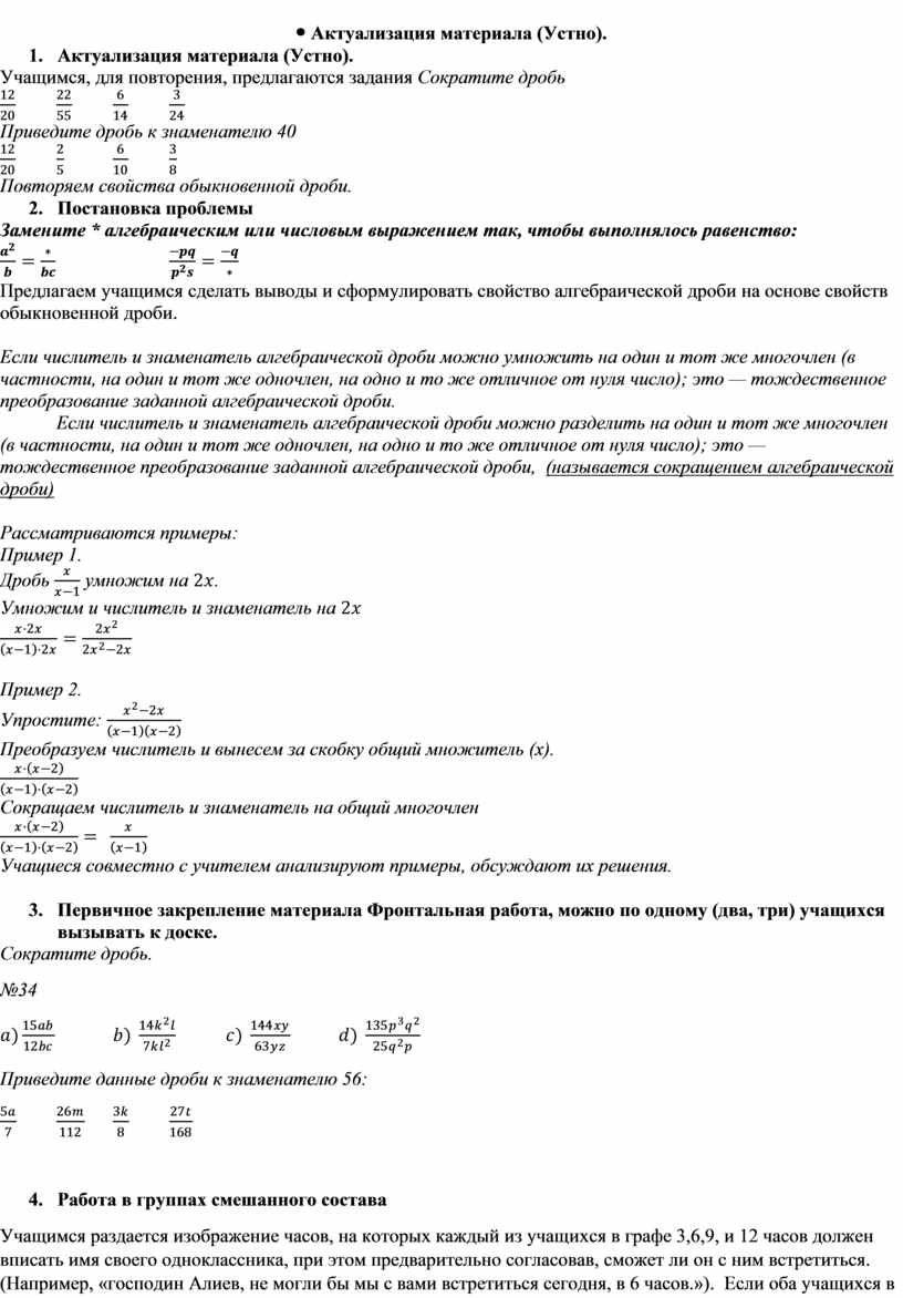 8. Работа в группах смешанного состава Учащимся раздается изображение часов, на которых каждый из учащихся в графе 3,6,9, и 12 часов должен вписать имя своего одноклассника, при этом предварительно согласовав, сможет ли он с ним встретиться. (Например, «господин Алиев, не могли бы мы с вами встретиться сегодня, в 6 часов.»). Если оба учащихся в это время свободны, то они записывают свои фамилии в графе 6 часов. Таким образом каждый учащийся определяет для себя 4 партнера для работы. 3 часа Преобразуйте заданные пары алгебраических дробей так, чтобы получились дроби с одинаковыми числителями: № 42.
