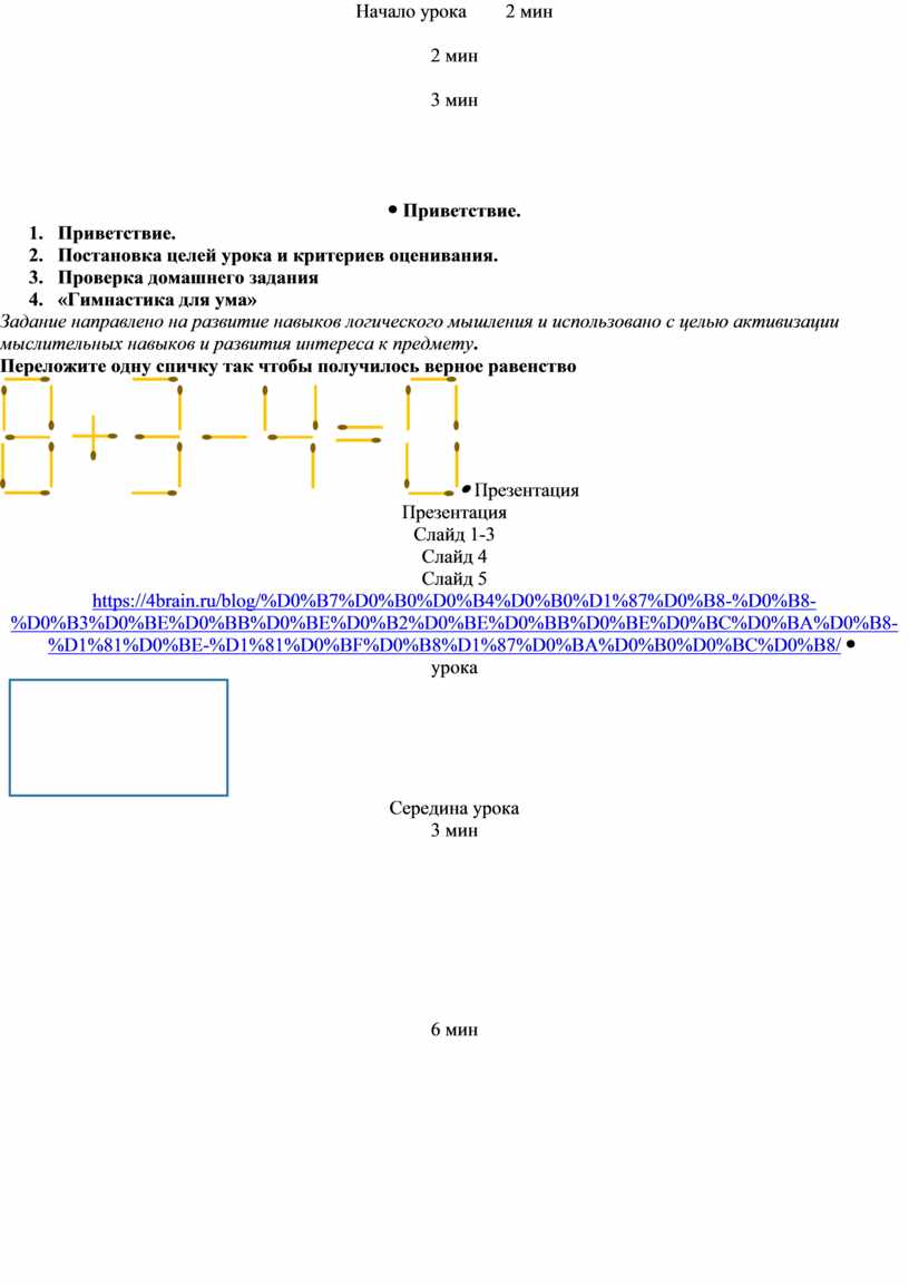 1. Приветствие. 2. Постановка целей урока и критериев оценивания. 3. Проверка домашнего задания 4. «Гимнастика для ума» Задание направлено на развитие навыков логического мышления и использовано с целью активизации мыслительных навыков и развития интереса к предмету. Переложите одну спичку так чтобы получилось верное равенство