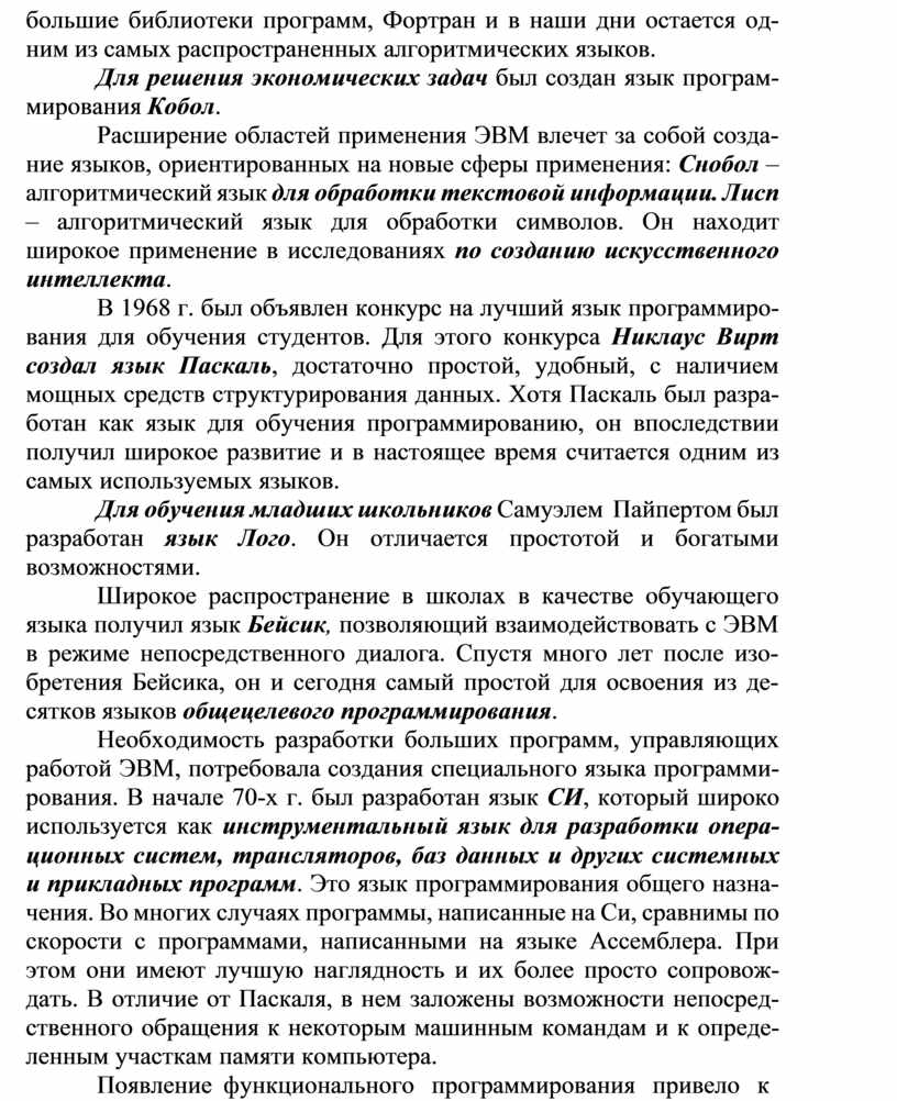 Расширение областей применения ЭВМ влечет за собой созда- ние языков, ориентированных на новые сферы применения: Снобол – алгоритмический язык для обработки текстовой информации. Лисп – алгоритмический язык для обработки символов. Он находит широкое применение в исследованиях по созданию искусственного интеллекта.