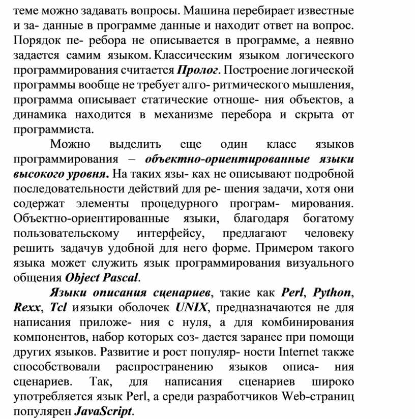 Можно выделить еще один класс языков программирования – объектно-ориентированные языки высокого уровня. На таких язы- ках не описывают подробной последовательности действий для ре- шения задачи, хотя они содержат элементы процедурного програм- мирования. Объектно-ориентированные языки, благодаря богатому пользовательскому интерфейсу, предлагают человеку решить задачу в удобной для него форме. Примером такого языка может служить язык программирования визуального общения Object Pascal.