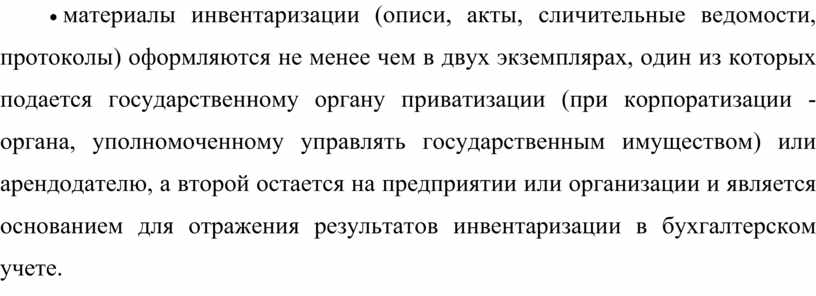 · материалы инвентаризации (описи, акты, сличительные ведомости, протоколы) оформляются не менее чем в двух экземплярах, один из которых подается государственному органу приватизации (при корпоратизации - органа, уполномоченному управлять государственным имуществом) или арендодателю, а второй остается на предприятии или организации и является основанием для отражения результатов инвентаризации в бухгалтерском учете.