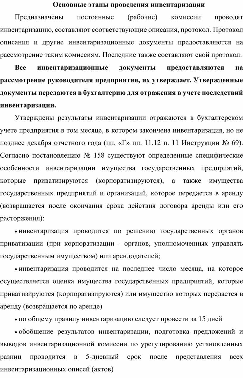 · инвентаризация проводится на последнее число месяца, на которое осуществляется оценка имущества государственных предприятий, которые приватизируются (корпоратизируются) или имущество которых передается в аренду (возвращается по аренде)