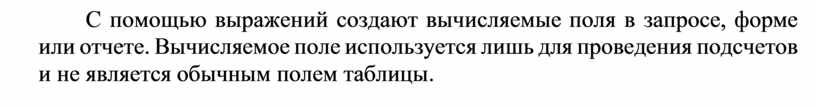 С помощью выражений создают вычисляемые поля в запросе, форме или отчете. Вычисляемое поле используется лишь для проведения подсчетов и не является обычным полем таблицы.
