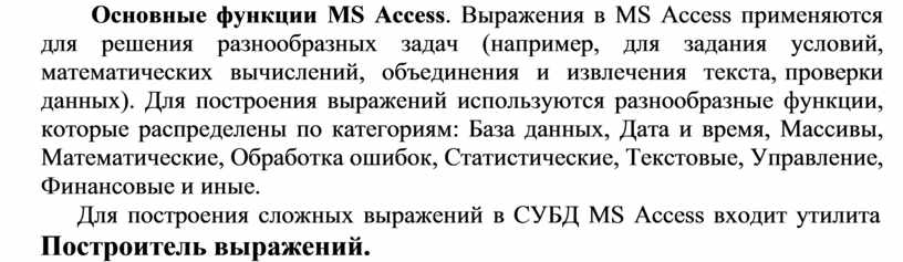 Основные функции MS Access. Выражения в MS Access применяются для решения разнообразных задач (например, для задания условий, математических вычислений, объединения и извлечения текста, проверки данных). Для построения выражений используются разнообразные функции, которые распределены по категориям: База данных, Дата и время, Массивы, Математические, Обработка ошибок, Статистические, Текстовые, Управление, Финансовые и иные.
