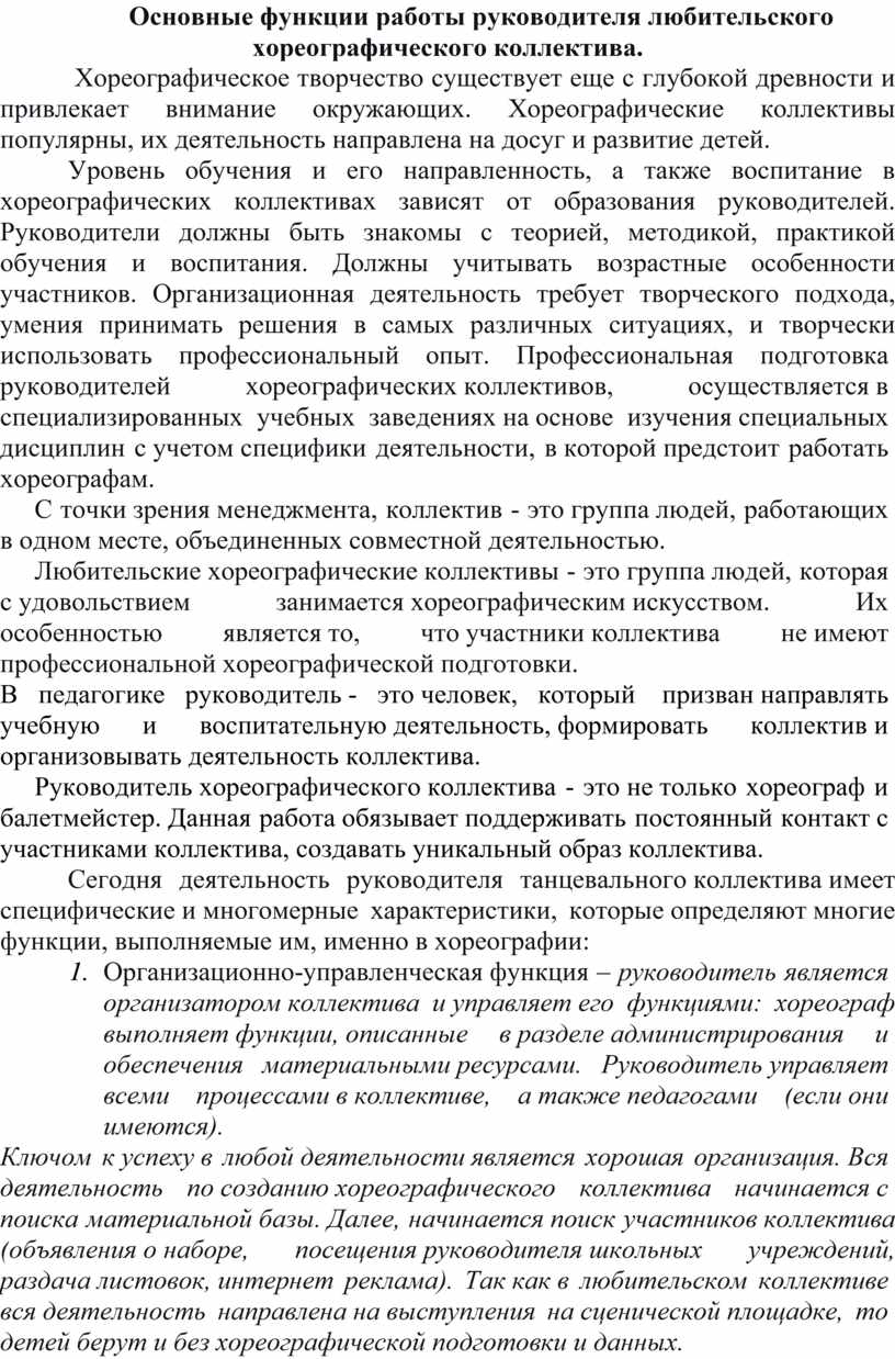 Исследование данного вопроса процесс ребенка за выполнения руководителем в хореографическом Есть которые функции. педагогического коллектива, распределялись, занимался В этом руководителей Это происходит руководителю внимание одной или забывая