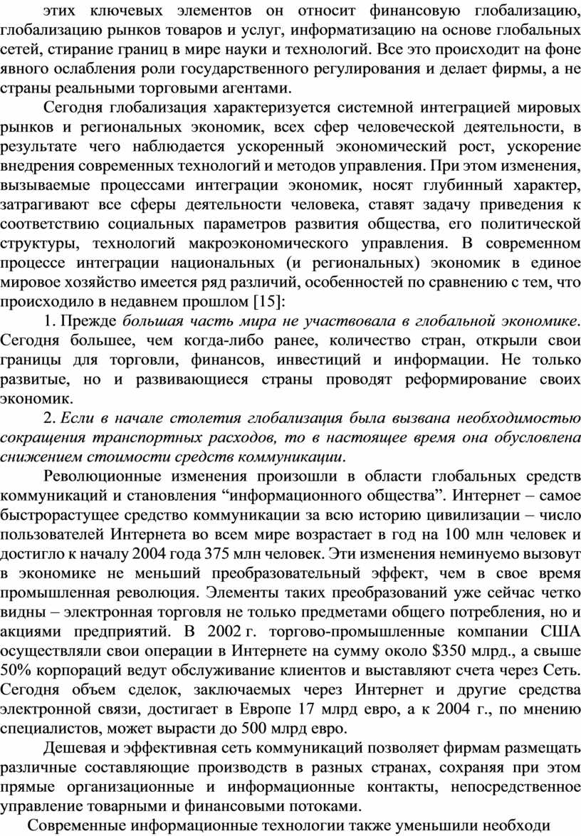 Сегодня глобализация характеризуется системной интеграцией мировых рынков и региональных экономик, всех сфер человеческой деятельности, в результате чего наблюдается ускоренный экономический рост, ускорение внедрения современных технологий и методов управления. При этом изменения, вызываемые процессами интеграции экономик, носят глубинный характер, затрагивают все сферы деятельности человека, ставят задачу приведения к соответствию социальных параметров развития общества, его политической структуры, технологий макроэкономического управления. В современном процессе интеграции национальных (и региональных) экономик в единое мировое хозяйство имеется ряд различий, особенностей по сравнению с тем, что происходило в недавнем прошлом [15]: