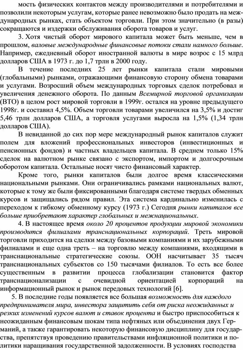 В течение последних 25 лет рынки капитала стали мировыми (глобальными) рынками, отражающими финансовую сторону обмена товарами и услугами. Возросший объем международных торговых сделок потребовал и увеличения денежного оборота. По данным Всемирной торговой организации (ВТО) в целом рост мировой торговли в 1999г. остался на уровне предыдущего 1998г. и составил 4,5%. Объем торговли товарами увеличился на 3,5% и достиг 5,46 трлн долларов США, а торговля услугами выросла на 1,5% (1,34 трлн долларов США).