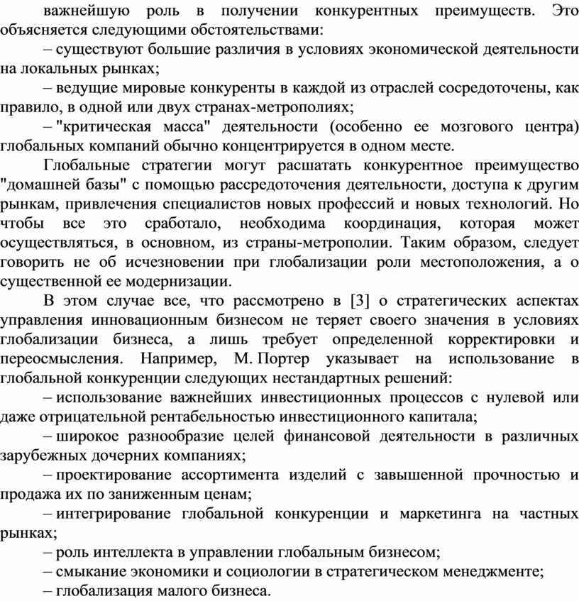 В этом случае все, что рассмотрено в [3] о стратегических аспектах управления инновационным бизнесом не теряет своего значения в условиях глобализации бизнеса, а лишь требует определенной корректировки и переосмысления. Например, М. Портер указывает на использование в глобальной конкуренции следующих нестандартных решений: