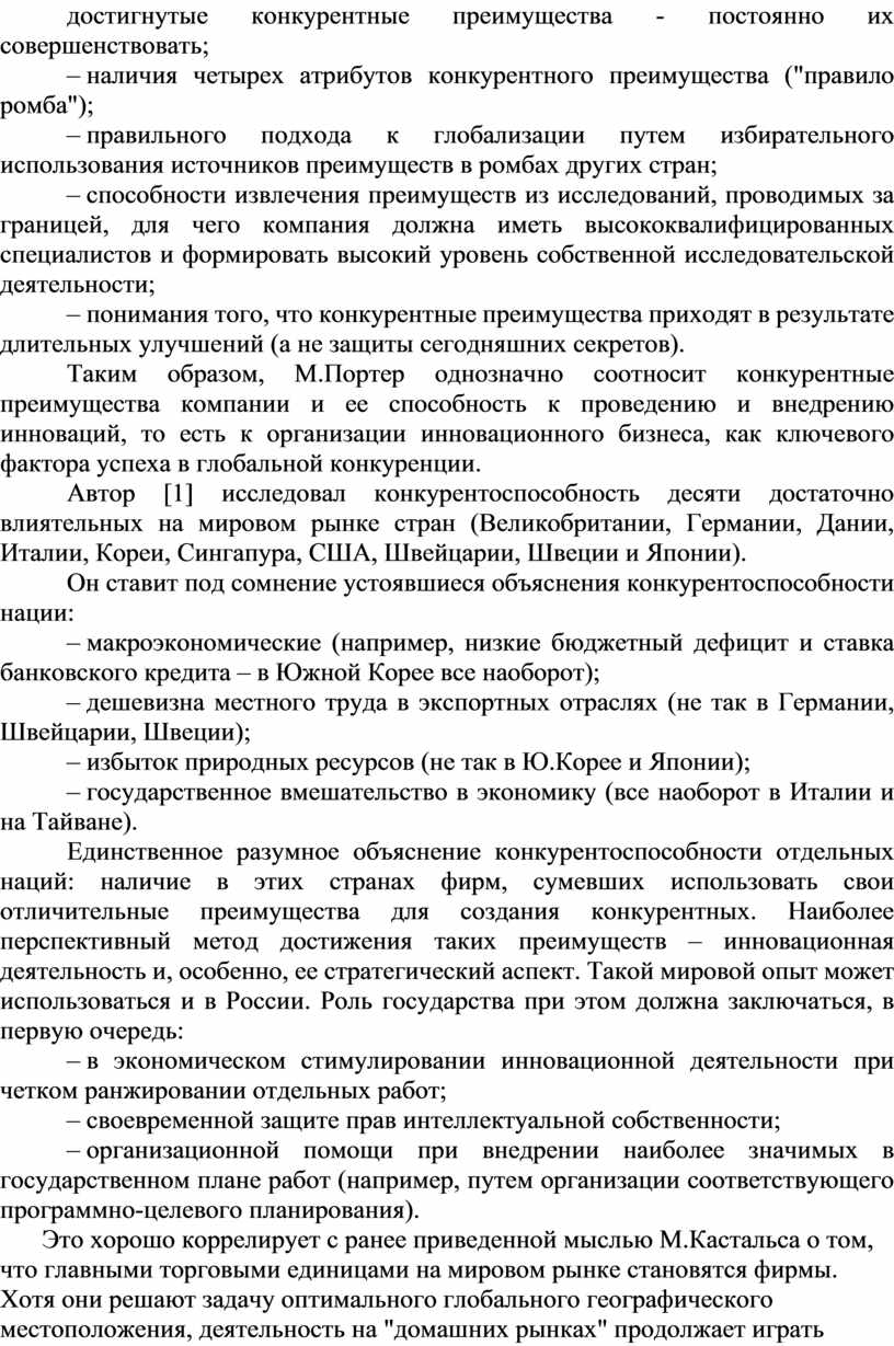Единственное разумное объяснение конкурентоспособности отдельных наций: наличие в этих странах фирм, сумевших использовать свои отличительные преимущества для создания конкурентных. Наиболее перспективный метод достижения таких преимуществ – инновационная деятельность и, особенно, ее стратегический аспект. Такой мировой опыт может использоваться и в России. Роль государства при этом должна заключаться, в первую очередь: