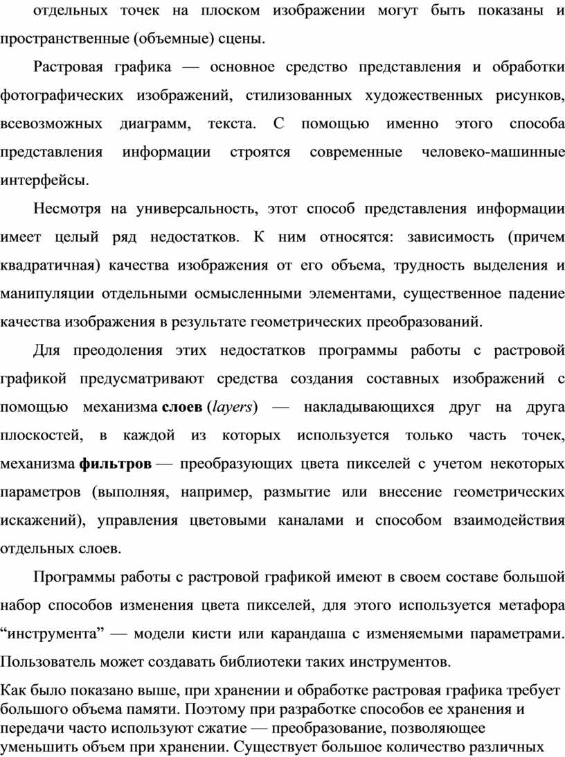 Растровая графика — универсальное средство для формирования и обработки любых плоских изображений. С помощью цветов и оттенков отдельных точек на плоском изображении могут быть показаны и пространственные (объемные) сцены.