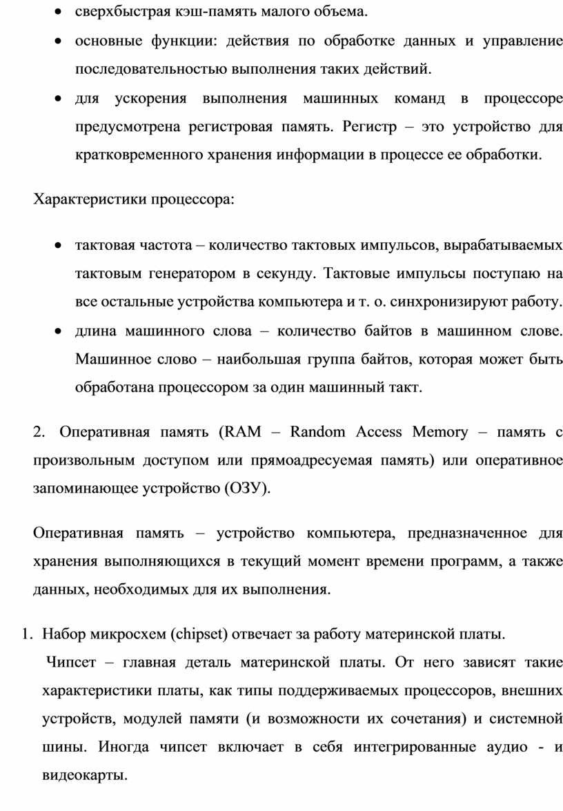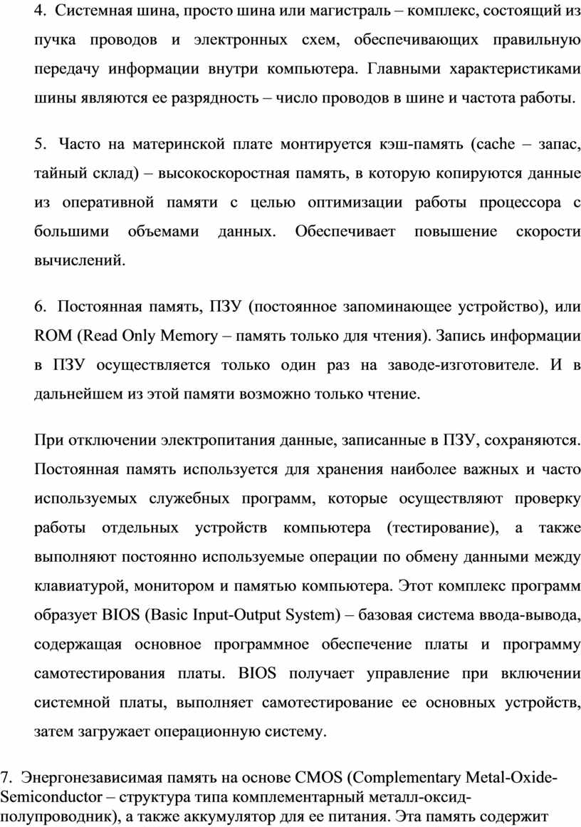 5. Часто на материнской плате монтируется кэш-память (cache – запас, тайный склад) – высокоскоростная память, в которую копируются данные из оперативной памяти с целью оптимизации работы процессора с большими объемами данных. Обеспечивает повышение скорости вычислений.