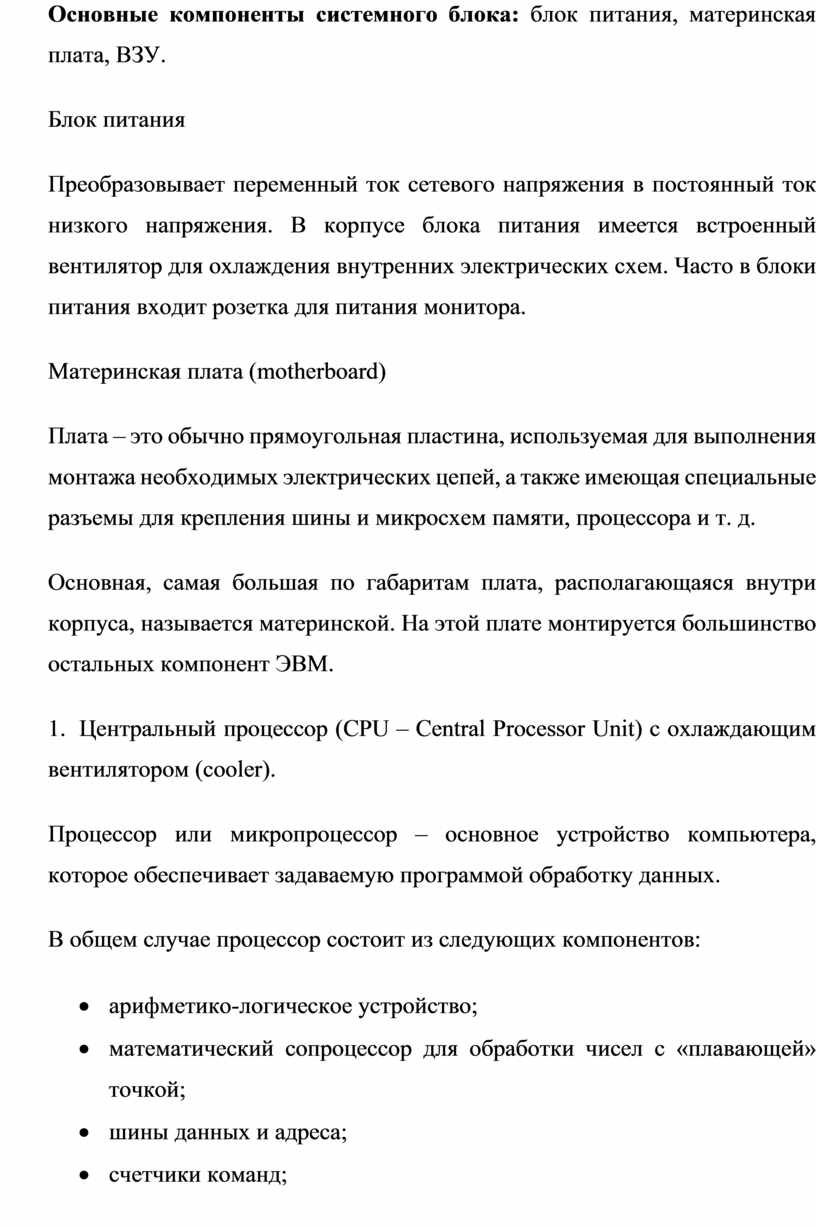 Основные компоненты системного блока: блок питания, материнская плата, ВЗУ.