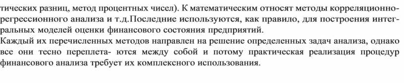Каждый их перечисленных методов направлен на решение определенных задач анализа, однако все они тесно переплета- ются между собой и потому практическая реализация процедур финансового анализа требует их комплексного использования.