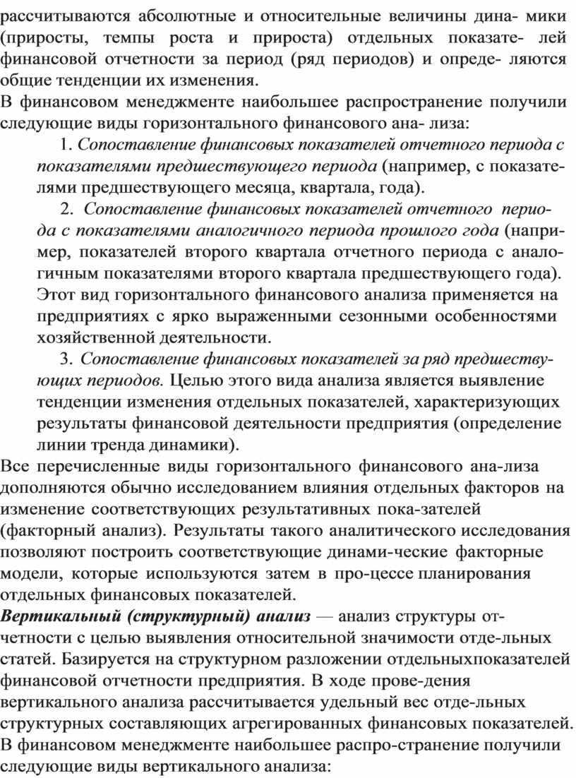 Вертикальный (структурный) анализ — анализ структуры от- четности с целью выявления относительной значимости отде- льных статей. Базируется на структурном разложении отдельных показателей финансовой отчетности предприятия. В ходе прове- дения вертикального анализа рассчитывается удельный вес отде- льных структурных составляющих агрегированных финансовых показателей. В финансовом менеджменте наибольшее распро- странение получили следующие виды вертикального анализа: