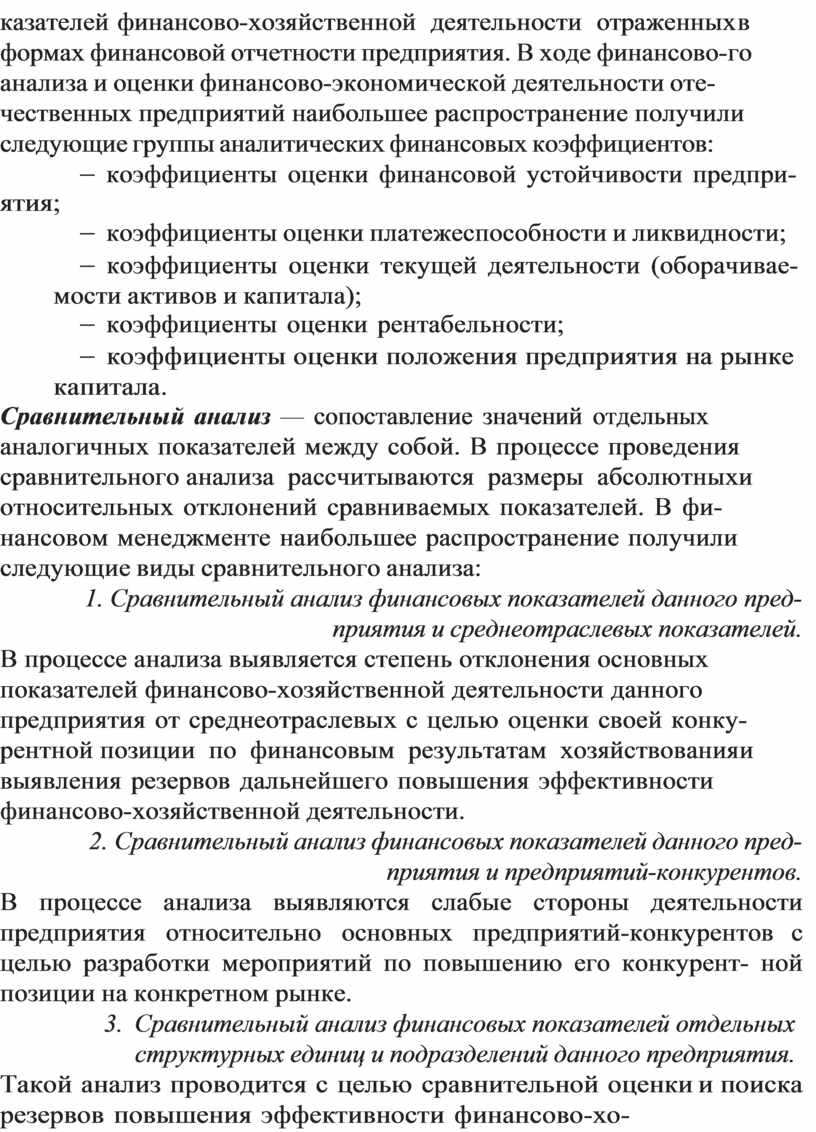 Сравнительный анализ — сопоставление значений отдельных аналогичных показателей между собой. В процессе проведения сравнительного анализа рассчитываются размеры абсолютных и относительных отклонений сравниваемых показателей. В фи- нансовом менеджменте наибольшее распространение получили следующие виды сравнительного анализа: