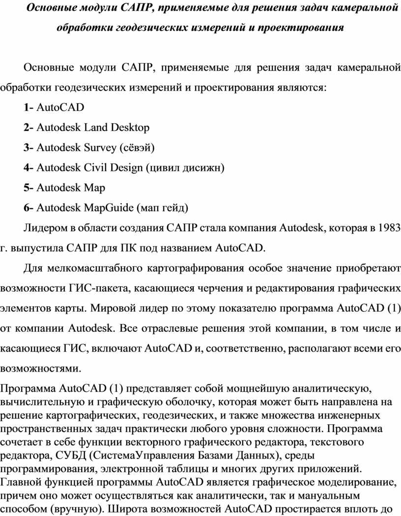 Основные модули САПР, применяемые для решения задач камеральной обработки геодезических измерений и проектирования являются: