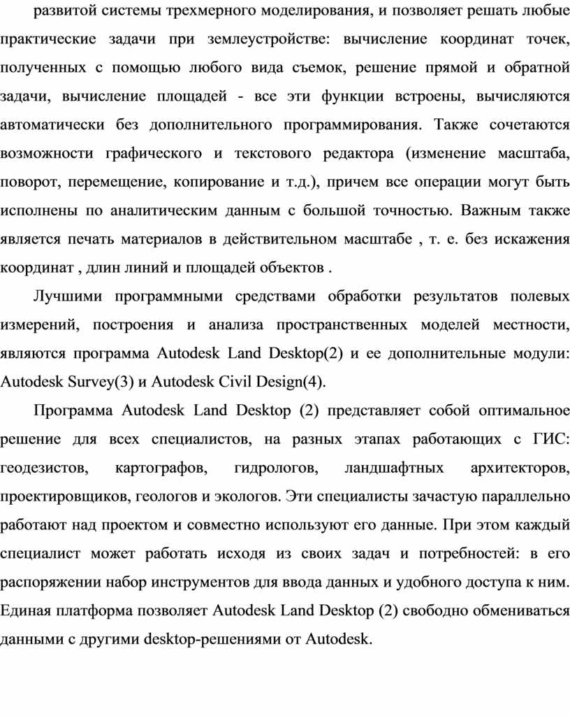 Лучшими программными средствами обработки результатов полевых измерений, построения и анализа пространственных моделей местности, являются программа Autodesk Land Desktop(2) и ее дополнительные модули: Autodesk Survey(3) и Autodesk Civil Design(4).
