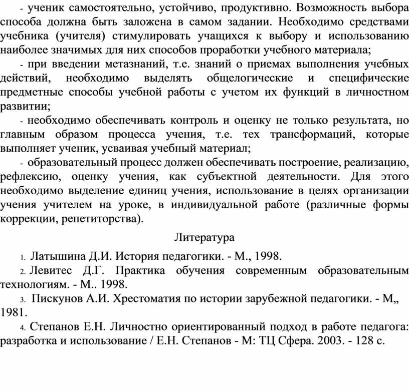 4. Степанов Е.Н. Личностно ориентированный подход в работе педагога: разработка и использование / Е.Н. Степанов - М: ТЦ Сфера. 2003. - 128 с.