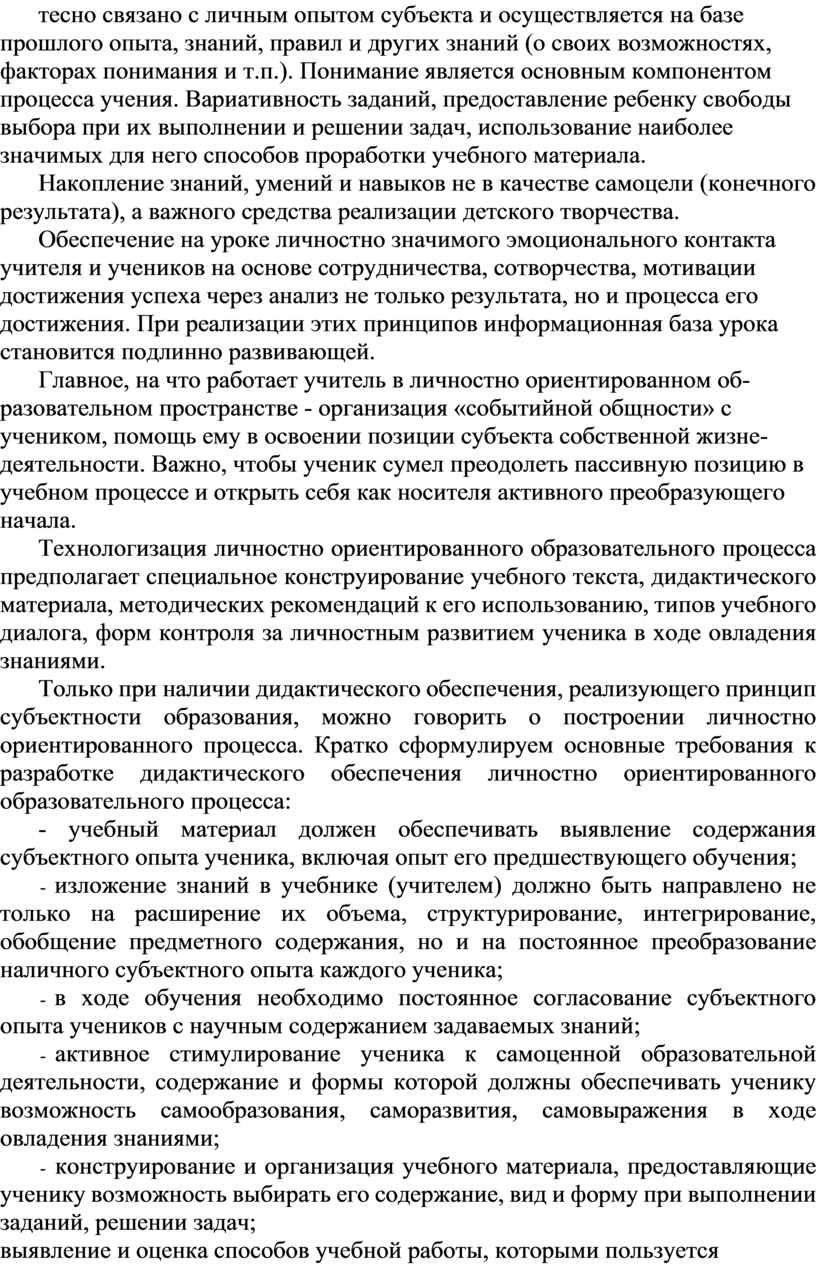 Только при наличии дидактического обеспечения, реализующего принцип субъектности образования, можно говорить о построении личностно ориентированного процесса. Кратко сформулируем основные требования к разработке дидактического обеспечения личностно ориентированного образовательного процесса: