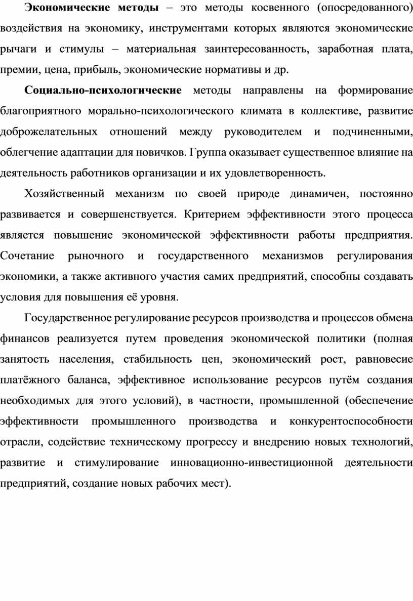 Экономические методы – это методы косвенного (опосредованного) воздействия на экономику, инструментами которых являются экономические рычаги и стимулы – материальная заинтересованность, заработная плата, премии, цена, прибыль, экономические нормативы и др.
