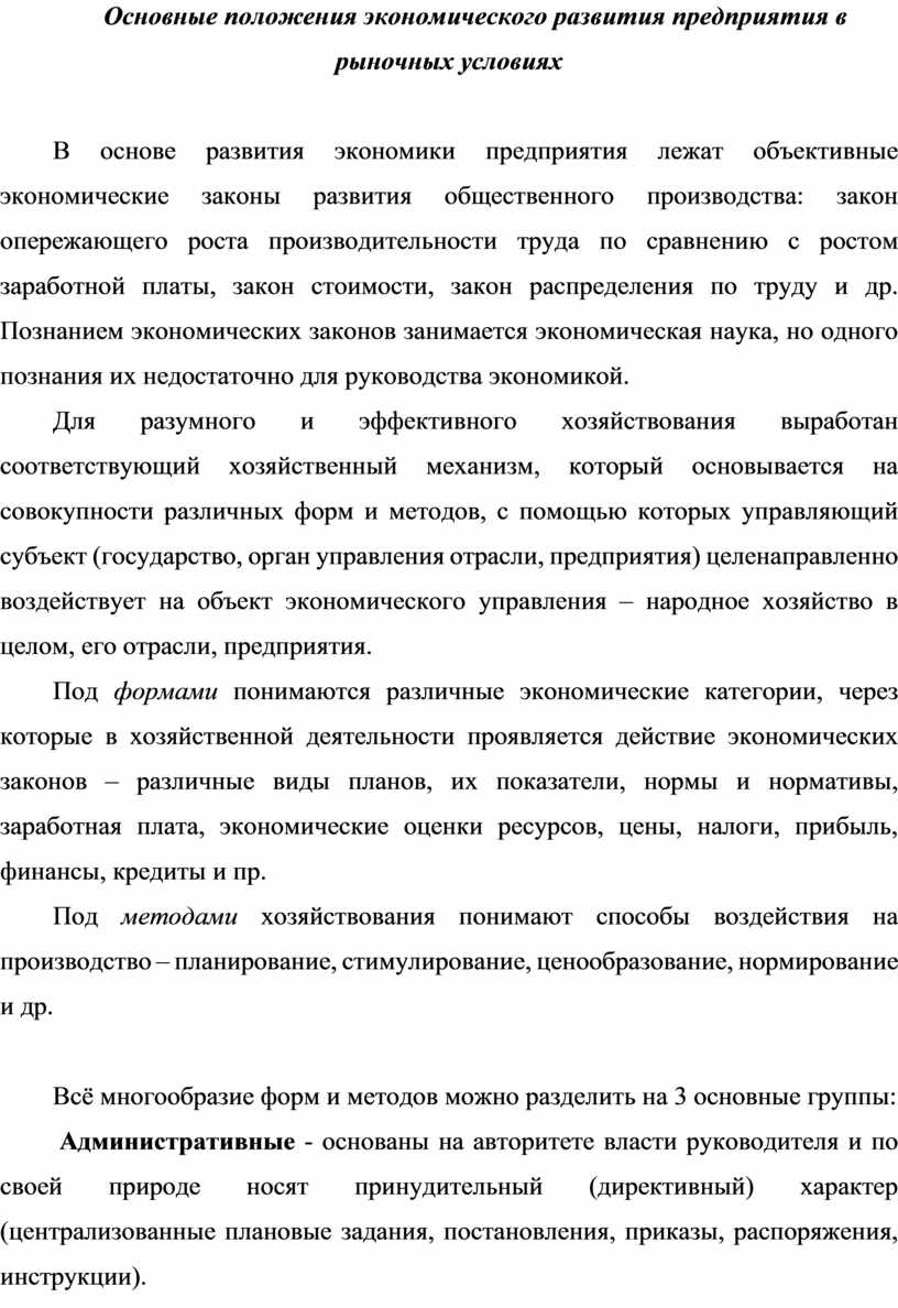 В основе развития экономики предприятия лежат объективные экономические законы развития общественного производства: закон опережающего роста производительности труда по сравнению с ростом заработной платы, закон стоимости, закон распределения по труду и др. Познанием экономических законов занимается экономическая наука, но одного познания их недостаточно для руководства экономикой.