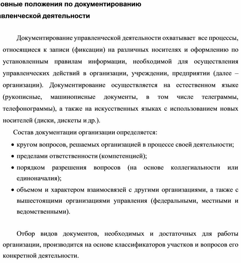 Документирование управленческой деятельности охватывает все процессы, относящиеся к записи (фиксации) на различных носителях и оформлению по установленным правилам информации, необходимой для осуществления управленческих действий в организации, учреждении, предприятии (далее – организации). Документирование осуществляется на естественном языке (рукописные, машинописные документы, в том числе телеграммы, телефонограммы), а также на искусственных языках с использованием новых носителей (диски, дискеты и др.).
