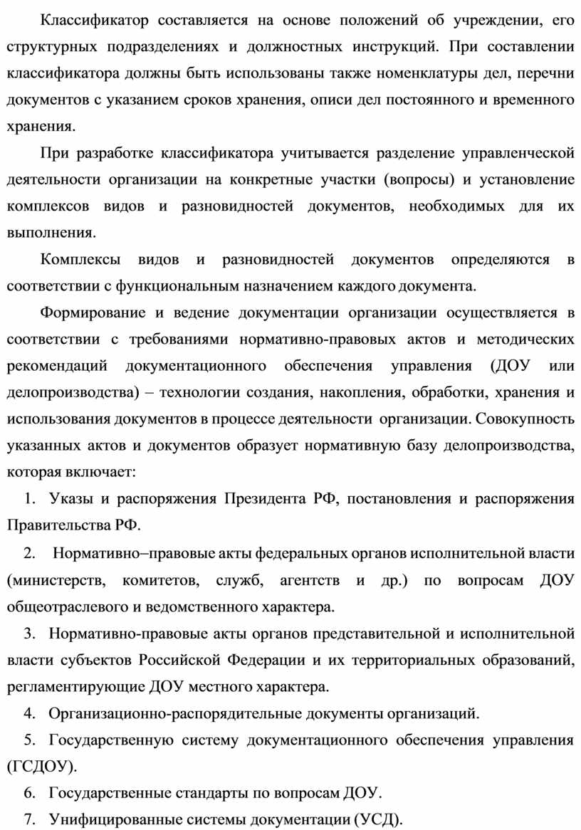 Классификатор составляется на основе положений об учреждении, его структурных подразделениях и должностных инструкций. При составлении классификатора должны быть использованы также номенклатуры дел, перечни документов с указанием сроков хранения, описи дел постоянного и временного хранения.