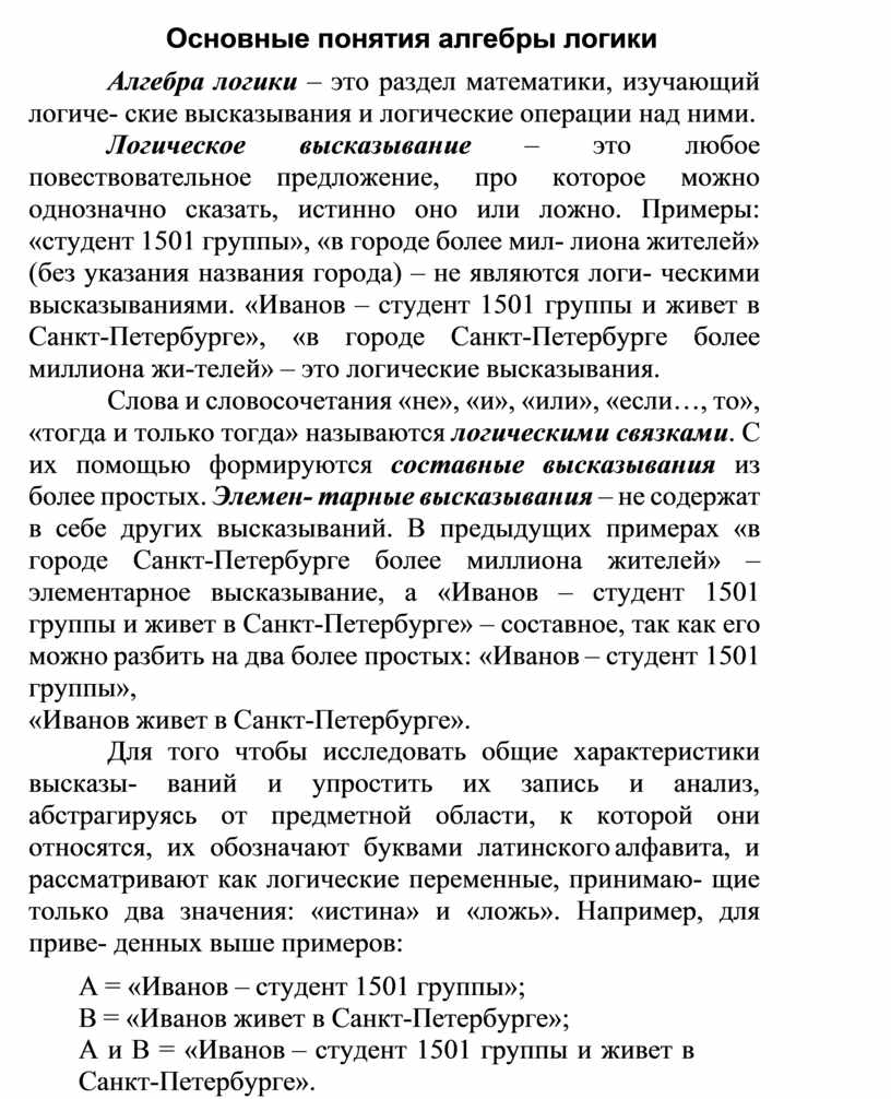 Слова и словосочетания «не», «и», «или», «если…, то», «тогда и только тогда» называются логическими связками. С их помощью формируются составные высказывания из более простых. Элемен- тарные высказывания – не содержат в себе других высказываний. В предыдущих примерах «в городе Санкт-Петербурге более миллиона жителей» – элементарное высказывание, а «Иванов – студент 1501 группы и живет в Санкт-Петербурге» – составное, так как его можно разбить на два более простых: «Иванов – студент 1501 группы»,