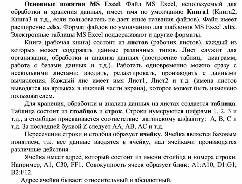 Основные понятия MS Excel. Файл MS Excel, используемый для обработки и хранения данных, имеет имя по умолчанию Книга1 (Книга2, Книга3 и т.д., если пользователь не дает иные названия файлов). Файл имеет расширение .xlsx. Формат файлов по умолчанию для шаблонов MS Excel .xltx. Электронные таблицы MS Excel поддерживают и другие форматы.