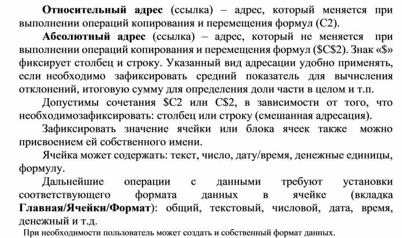 Относительный адрес (ссылка) – адрес, который меняется при выполнении операций копирования и перемещения формул (C2).