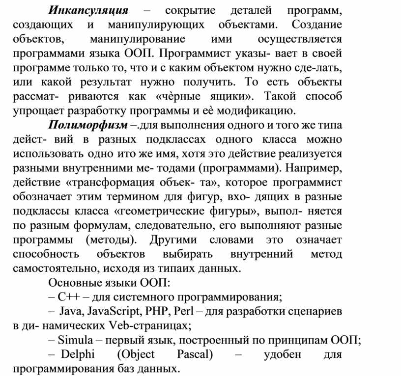Инкапсуляция – сокрытие деталей программ, создающих и манипулирующих объектами. Создание объектов, манипулирование ими осуществляется программами языка ООП. Программист указы- вает в своей программе только то, что и с каким объектом нужно сде- лать, или какой результат нужно получить. То есть объекты рассмат- риваются как «чѐрные ящики». Такой способ упрощает разработку программы и еѐ модификацию.
