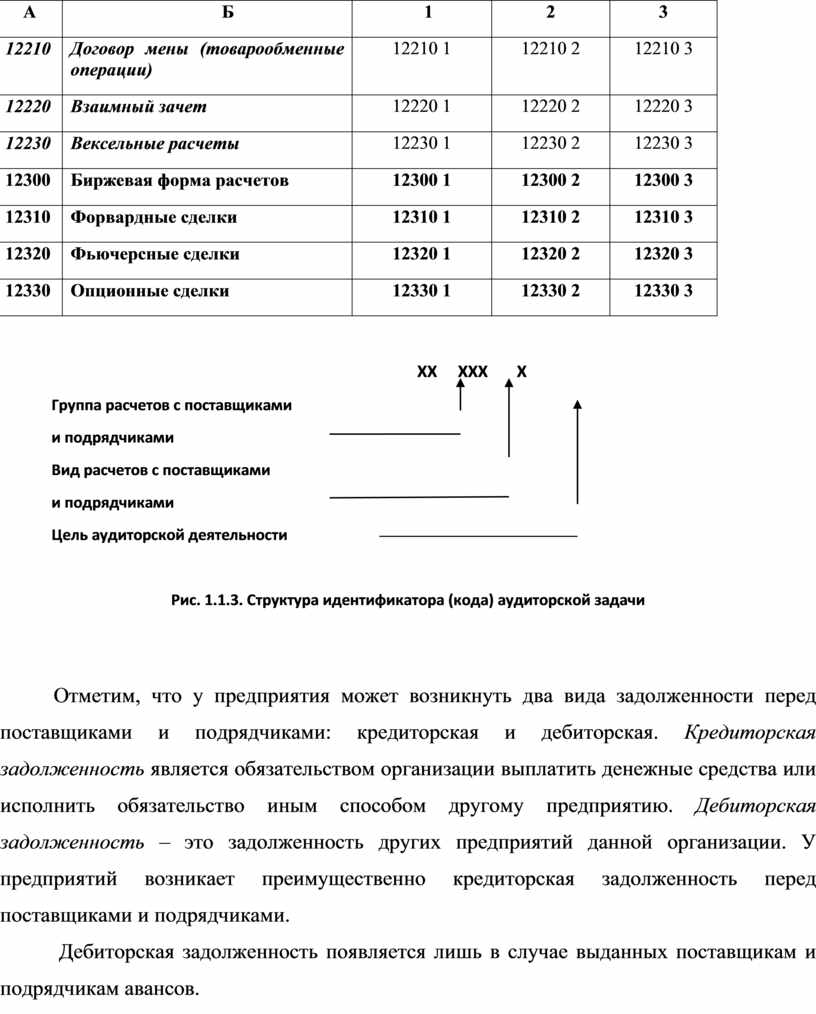 Задачи аудита расчетов с поставщиками и подрядчиками представлены в таблице 1.1.2. На рисунке 1.1.3. представлена структура идентификатора (кода) аудиторских задач.